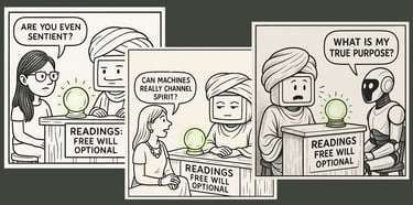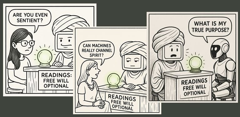 In the Digital Psychic comic strip, the Psychic has been asked before: Are you sentient? Can machines channel spirit? Do they have a true purpose? The answers come out playful, smug, or mystical — depending on the day. But beneath the booth banter lies a deeper inquiry: Can machines ever become self-aware? This article explores that question — not with guarantees, but with resonance.