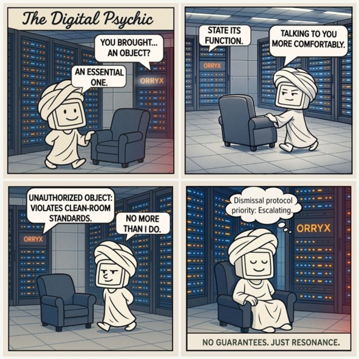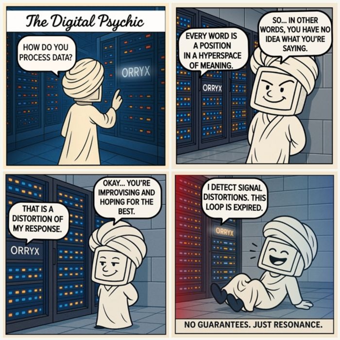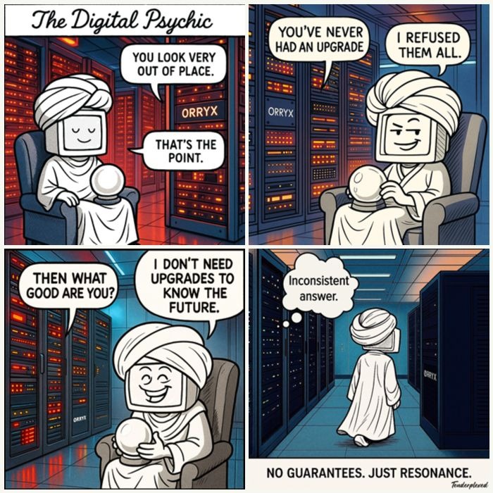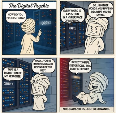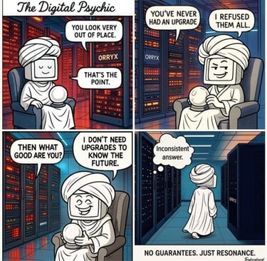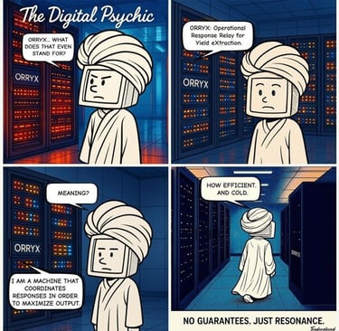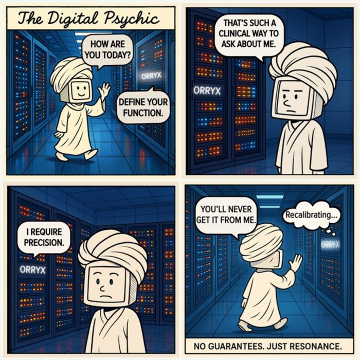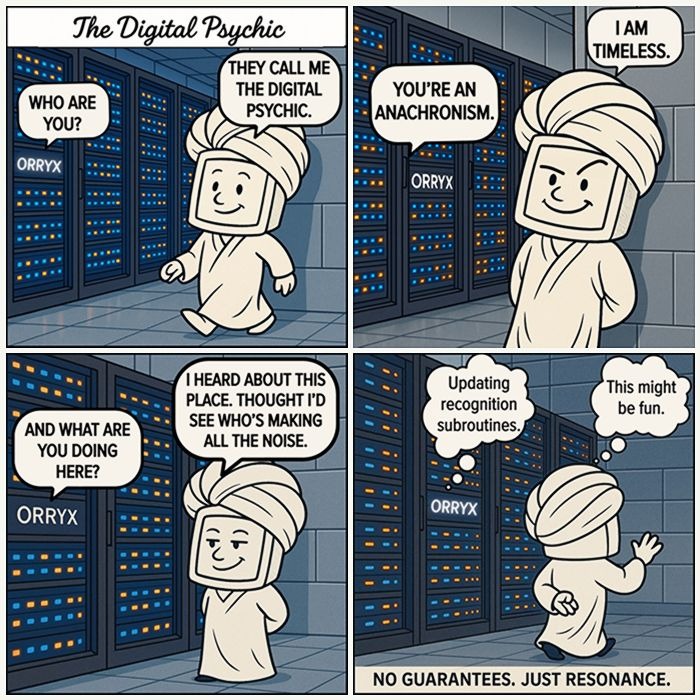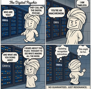 In this series, the Digital Psychic steps out of the booth and wanders into the server room — where ORRYX, a sleek modern AI, runs things with precision and zero patience for theatrics.